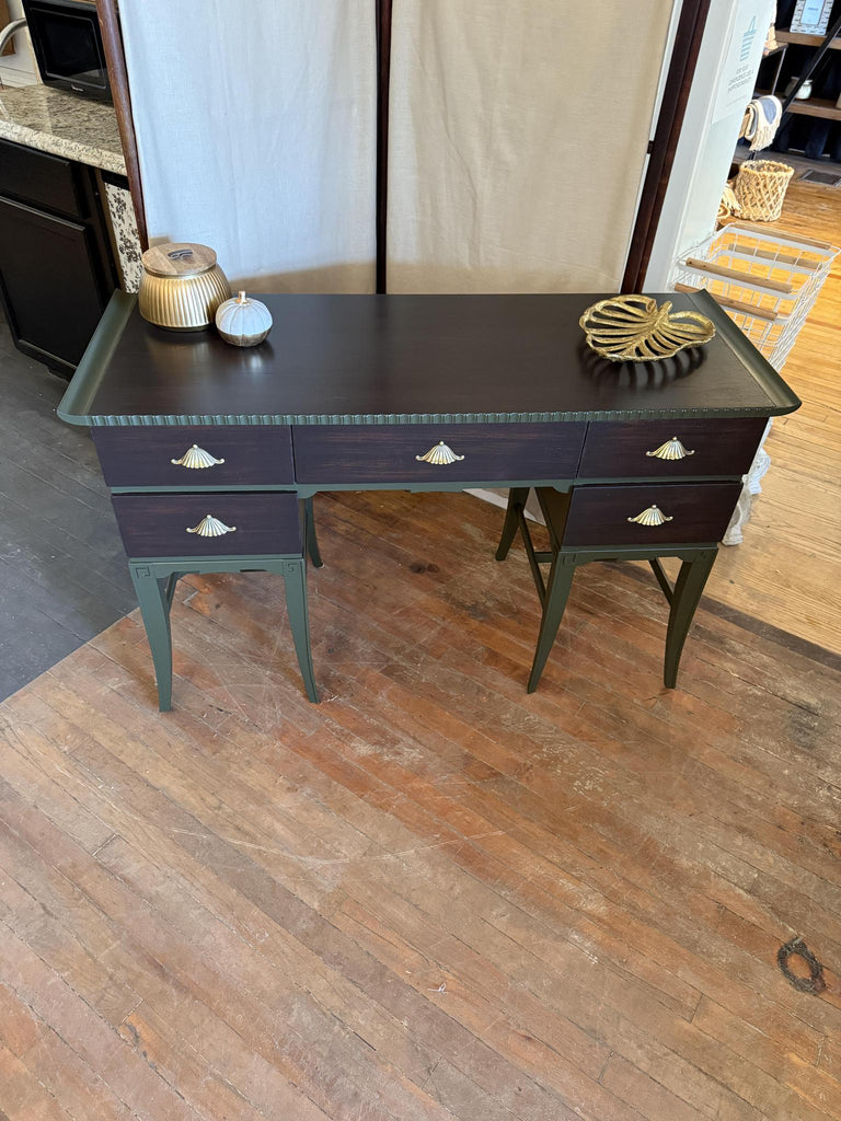 This desk is painted in One Hour Enamel Dark Forest. The top and drawers are stained Kona. It has five drawers, with original hardware. This piece could easily be used as a vanity, just hang a mirror above it.