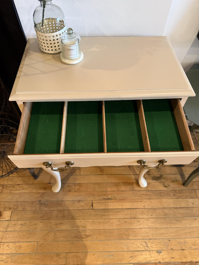 This chest of drawers was made to hold your fine silverware. The drawers include a felt lined insert and three removable spacers. These items can easily be removed or kept to store other items. I like the thought of using it as a jewelry holder. Painted in Wise Owl One Hour Enamel Linen. Original hardware painted in Wise Owl Bronze Metallics paint.